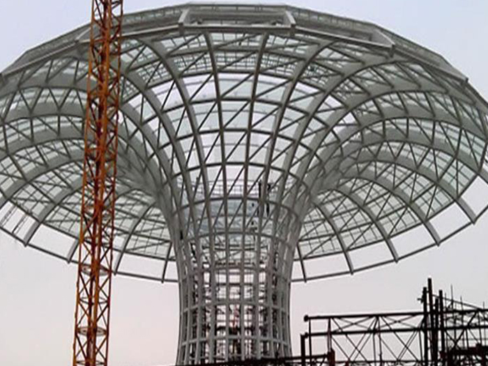 二、球形网架结构因其结构新颖,受力合理,自重轻、用钢量低等优点。如大型体育场馆球形林州螺栓球网架、公共场馆球形网架、电厂林州螺栓球网架、水泥工业球形网架、仓储物流球形网架、林州干煤棚工业球形网架、林州收费站林州加油站球形网架、展览中心、影剧院、商场、航站楼、候车厅、工厂林州车间、仓库、电视塔等球形螺栓球节点网架。国内球形网架结构主要分为:林州焊接球节点网架及螺栓球节点网架两种。螺栓球节点网架其构件工厂内加工量较大,现场安装便捷,适用于现场工期紧,林州施工条件、用电量受制约,网架形状复杂、林州杆件定位困难的异形结构。螺栓球节点球形网架系统基本由林州杆件、螺栓球、支撑支座等组成。按照节点形式可分为交叉林州桁架体系、四角锥体系、三角锥体系等。支撑方式多为固定支座支撑。对于大面积、大跨度及有特殊受力或伸缩要求的网架结构可采用橡胶支座、滑移支座、球铰支座等支撑形式,以满足结构自身的受力稳定、均衡,便于内力释放等设计要求。